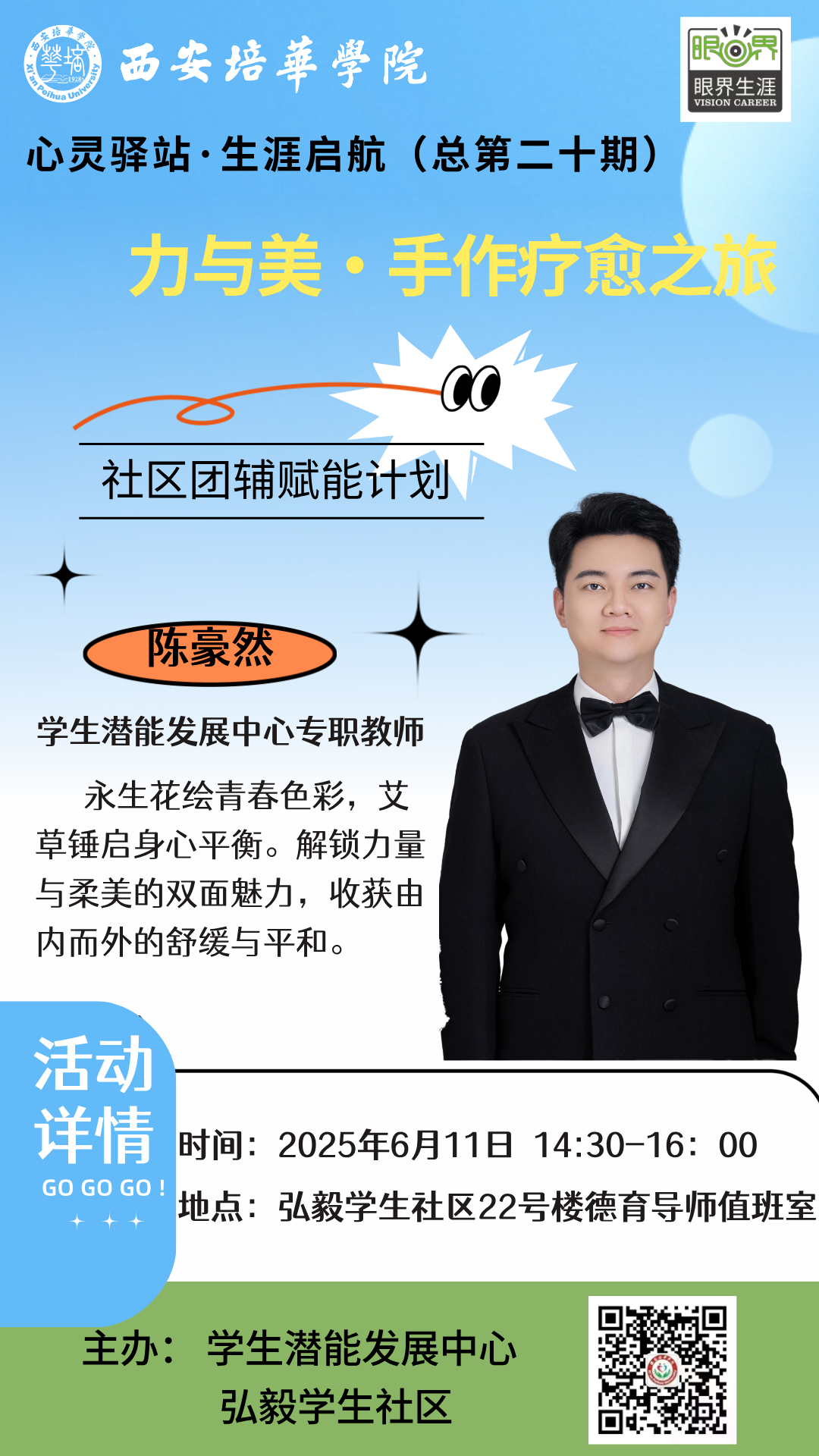 6月12日下午,由学生潜能发展中心陈豪然老师带领体育学院十名学生在弘毅学生社区开展“力与美·手作疗愈之旅”活动。此次活动是针对体育学生的特别活动,对于日常较强的运动量,身体和心理的放松都显得尤为重要。一场融合艺术与养生的奇妙之旅,借以DIY手作的形式,社区团辅赋能,让学生在制作手工的过程中得到心理的放松、压力的释放,将健康带给学生,把温暖带进社区。