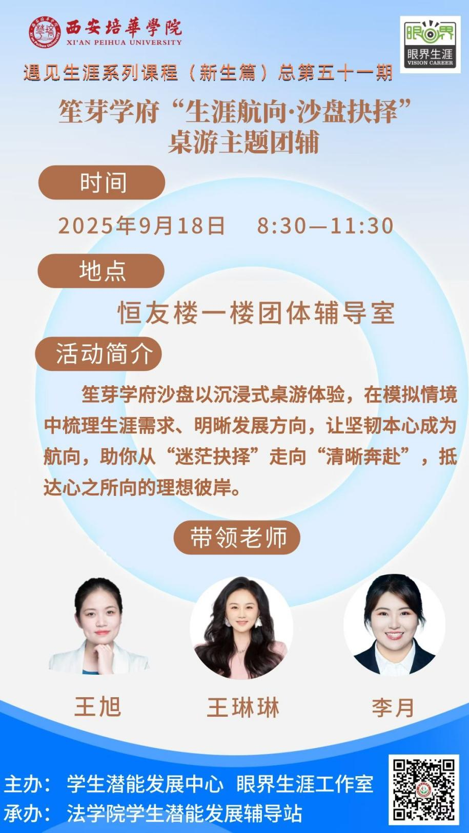为助力法学院2025级新生更好地适应大学生活、探索个人潜能、提升规划意识,学生潜能发展中心近期在恒友楼团体辅导室举办笙芽学府“生涯航向·沙盘抉择”桌游主题团辅。本次沙盘团辅活动由学生潜能发展中心王琳琳老师、王旭老师以及法学院辅导员李月老师组织开展,法学院2025级新生代表参与,旨在通过沉浸式的沙盘情景模拟,引导新生在体验中思考并明晰大学四年的学业规划。