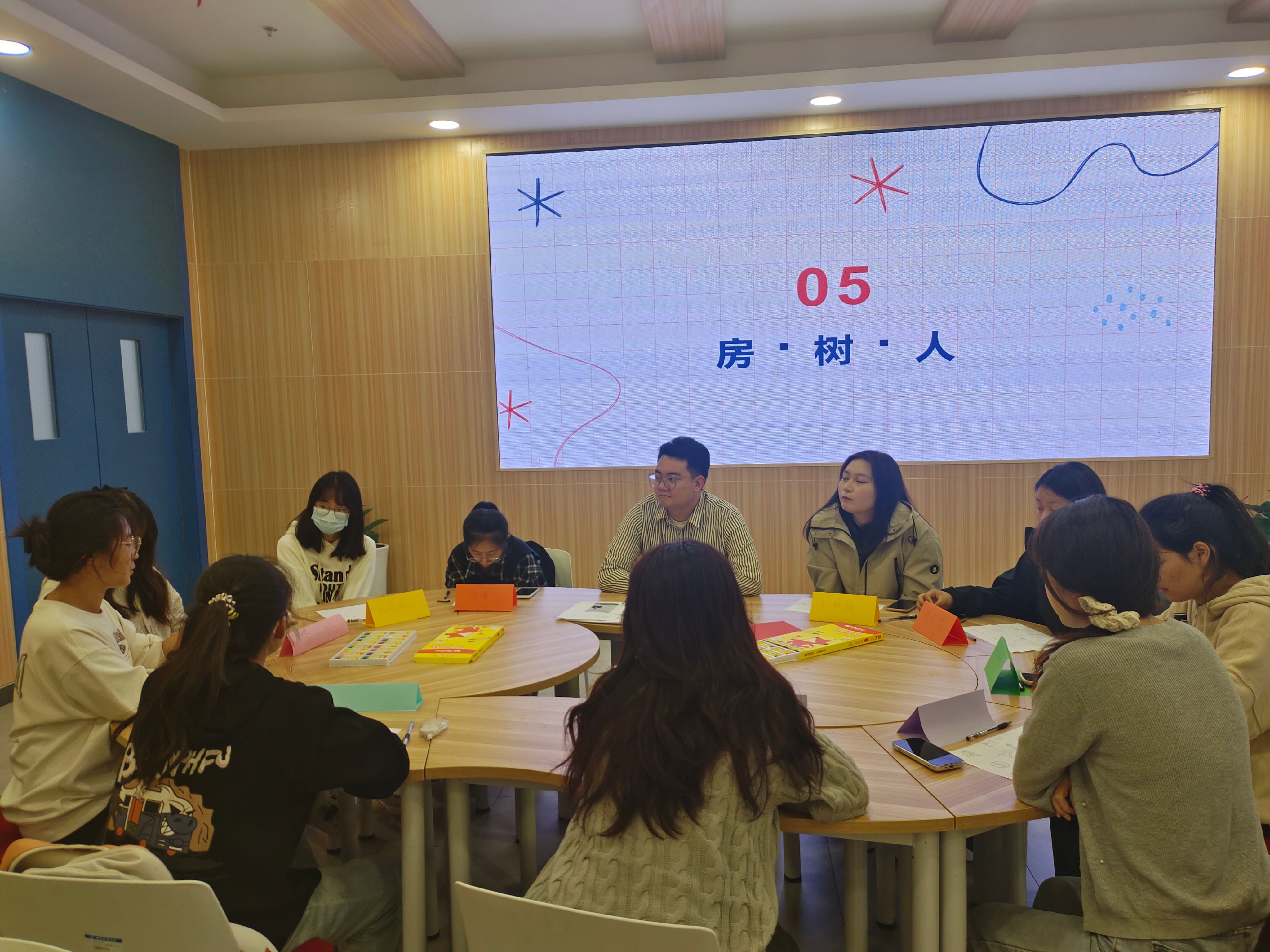 通过游戏“大观园”、“你是·我是”,绘画“生涯九宫格”、“房树人”等活动,大家在轻松愉快的表达性艺术体验中认识自我世界和探索工作世界,从而找寻和感知自己的职业呼唤,充分发散思维联系自我世界与工作世界以及与职业相关的内容。陈老师和同学们一起在表达分享中分析,用分析的线索指导探索的方向,从而促进每一位同学的分享更深刻,表达的更淋漓尽致,达到呼唤的目标。