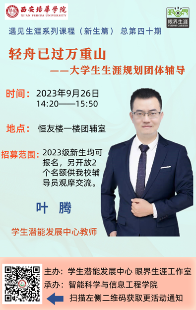 为促进我校23级大一新生更快适应大学校园生活,明确职业规划和目标,更好地融入集体,增强人际交往能力。由学生潜能发展中心主办,智能科学与信息工程学院承办的遇见生涯系列课程(新生篇)总第四十期“轻舟已过万重山”与2023年9月26日下午2:20在恒友楼―楼如期开展,本次活动由中心专职教师叶腾带领,智能科学与信息工程学院24名来自大一新生参加。