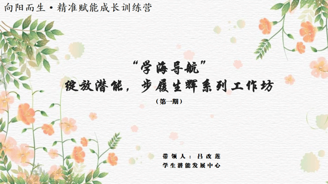 12月12日晚18:30,由学生潜能发展中心、《“AI+六阶”护航大学生心理健康成长精准赋能行动的实践与探索》项目组联合心灵花园工作室、眼界生涯工作室共同打造的“学海导航”——绽放潜能,步履生辉系列工作坊第一期在恒友楼知爱室顺利举行。本次活动由吕改莲老师带领,8名学业困难学生参加了活动。