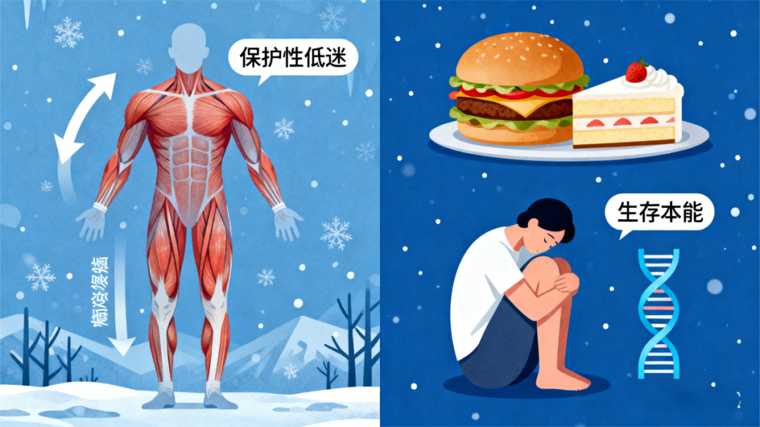寒冷会让肌肉紧张、血液循环减慢,身体自动进入“保护性低迷”状态,你会本能地不想动、只想吃高热量食物囤积脂肪一—这是老祖宗刻在DNA里的生存本能!