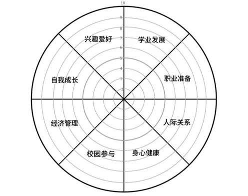 第一步,搭好平衡轮框架:围绕学业发展、职业准备等8个维度,建好生涯平衡轮;
