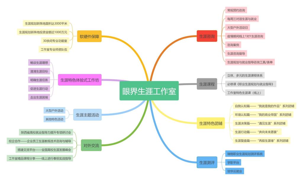 眼界生涯工作室创办于2018年,旨在通过生涯教育和思想引领,帮助大学生拓宽看待世界的深度和广度。工作室是大学生生涯咨询与教育教学创新创造、技术交流、成果转化的“工作站”。眼界生涯工作室以学校学生潜能发展中心为依托,学校投入近1000万元建设了3000余平米,拥有30余间理念先进、功能完备、设备齐全的高水平生涯育人新阵地。配备有生涯彩虹涂鸦室、生涯幻游室、生涯咨询室、沙盘室、表达性艺术工坊(陶艺、剪纸、烘焙等)、生涯朋辈小屋、音乐养心室、大中型团体辅导室、预约接待室等专业的功能室,同时配备专业的职业测试软件,该设置突出服务学生生涯发展性目标的主题,为工作室开展全校学生生涯规划教育提供了充足的硬件保障。