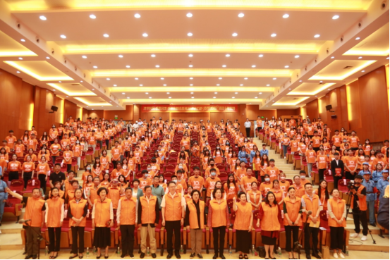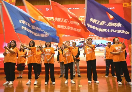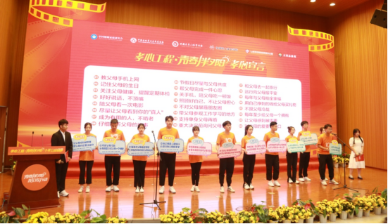 与会领导和嘉宾共同向学校代表授“青春伴夕阳”志愿者团旗,启动了新一年度“孝心工程·青春伴夕阳”活动。鲜艳的旗帜在空中飘扬,这是孝心、爱心传承,也是青春坚定的承诺。