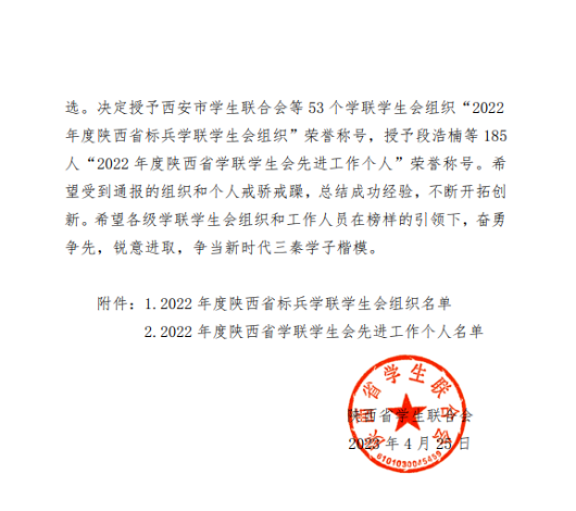 近日,陕西省学生联合会下发了《关于2022年度陕西省标兵学联学生会组织、陕西省学联学生会先进个人的通报》,西安培华学院员泽阳同学被评为“2022年度陕西省学联学生会先进工作个人"。