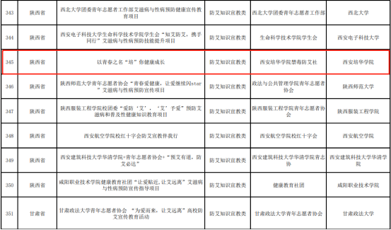 近日,中国性病艾滋病防治协会公布了《中国性病艾滋病防治协会高校防艾基金项目拟资助名单-防艾知识宣教类》。学校申报的《以青春之名“培”你健康成长》项目成功入选2023年度中国性病艾滋病防治协会高校防艾基金项目。