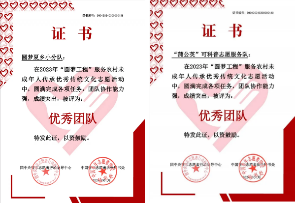 近日,由团中央青年志愿者行动指导中心、中国青年志愿者协会秘书处联合公布2023年“圆梦工程”服务农村未成年人传承优秀传统文化志愿服务优秀项目。学校人文与国际教育学院圆梦夏乡社会实践队、智能科学与工程学院“蒲公英”科普志愿服务队荣获优秀团队。