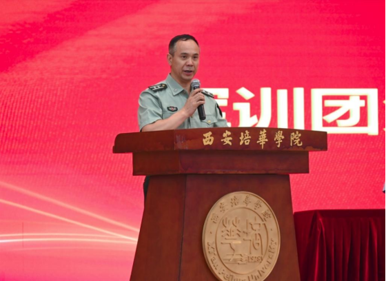 党委副书记、副校长姚文静做军训动员讲话,她代表军训办公室向全体参训的新同学们表示热烈欢迎,并强调了组织新生军训的重要意义。向全体参训师生提出三点希望和要求:一是希望教官们能够坚守标准、严格要求。在理论学习、技能训练、内务整理、行军拉练等各项任务中,锤炼过硬品质、提升业务能力,让同学们能够树立良好习惯;二是希望教官们以身作则、用心指导。既有严谨的态度,也有悉心的付出,让同学们在军训这堂“开学第一课”里,能够学习到坚韧不拔的意志品质、团结协作的集体精神和严谨求实的生活作风;三是希望教官们围绕中心、服务大局。军训,也是培华学子必修的一堂“大思政课”,在这项的工作中,全体参训人员要将开训动员与入学教育相结合、将纪律管理与学校管理相结合、将爱国主义与国防意识相结合、将激发热情与明确要求相结合,把“小我”融入到国家、社会、学校不同层面的“大我”之中,引导同学们在青春绿茵场上“扣好人生的第一粒扣子”。最后,她号召同学们认真完成军训任务,在学校迈向百年建设的征程上,用青春“橄榄绿”为百年“培华红”再添光彩。