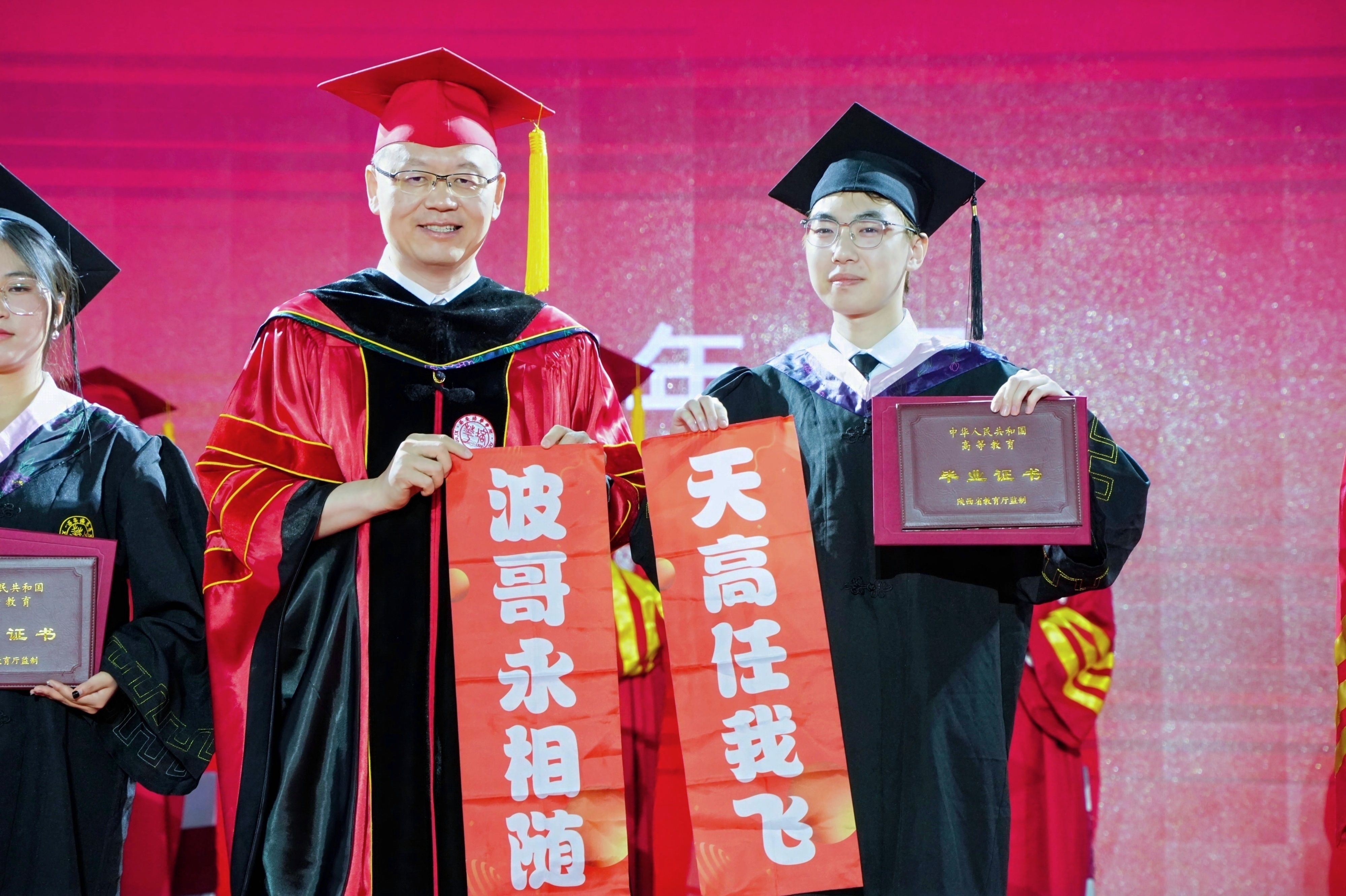 校领导们共同为毕业生代表颁发毕业证书、学位证书,并拨穗授礼。期间,毕业生代表们也送上了寓意美好的礼品,表达感激之情。