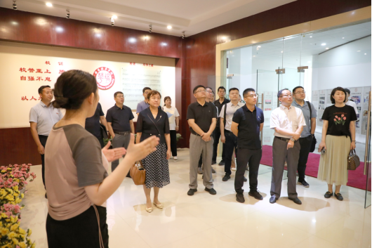 欢迎仪式结束后,钟山职业技术学院翟天灵一行在校党委书记罗新远、校长办公室主任李健等陪同下,参观了校史馆、医学院(干细胞与再生医学中心)、学生文体中心、毕业生作品展、一带一路供应链金融研究院,考察学校教育教学、校企合作、基层党组建设等方面的经验和做法。