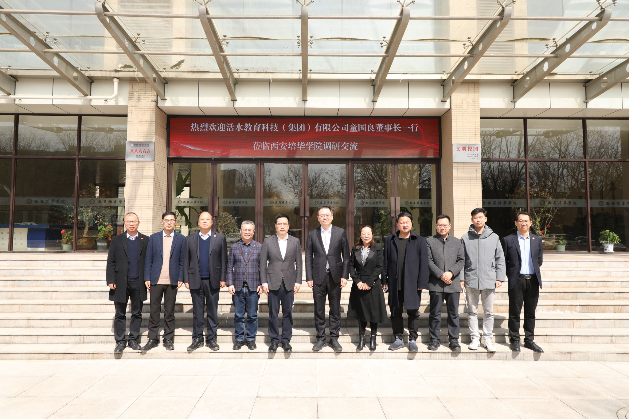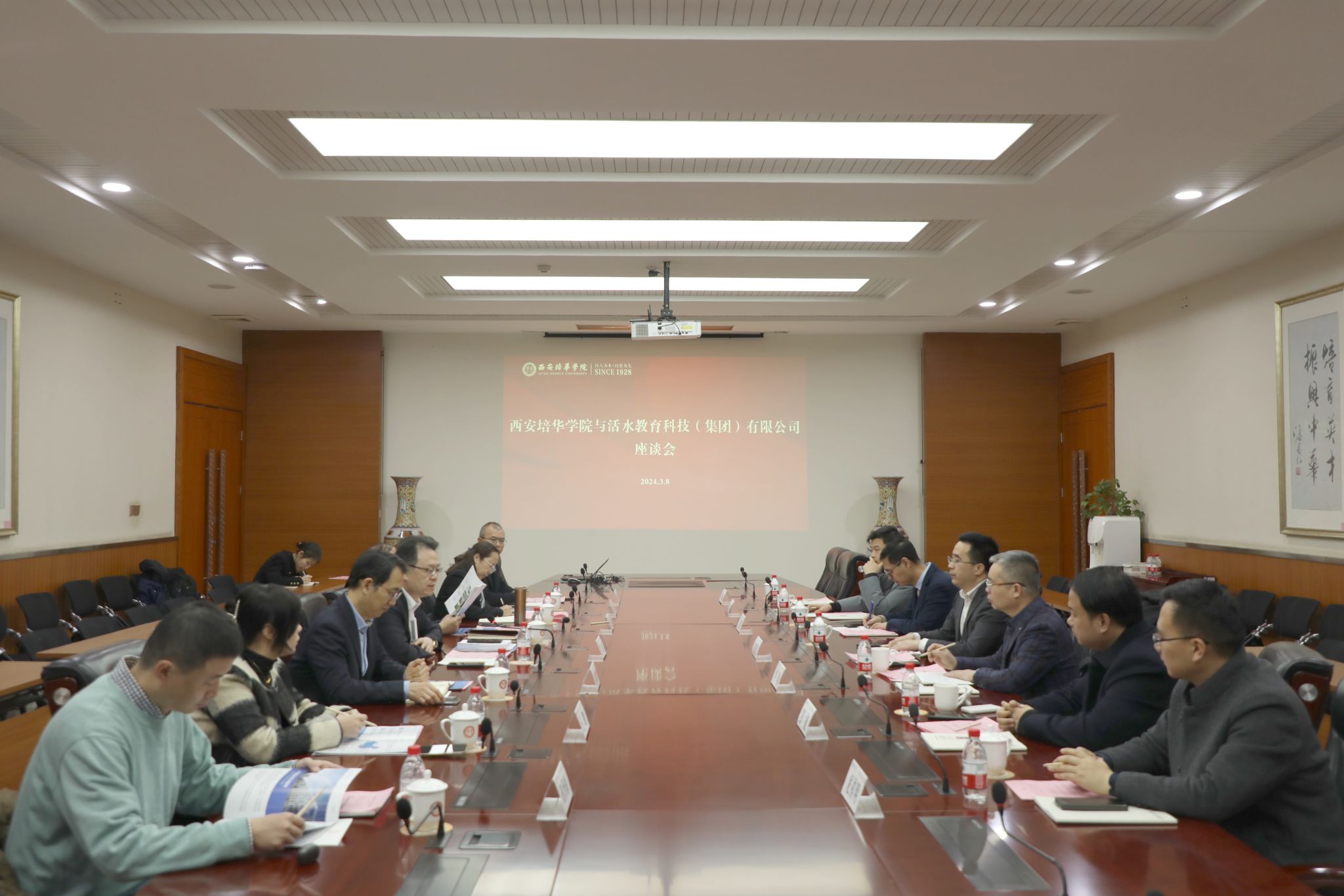 3月8日上午,活水教育科技(集团)有限公司一行来到学校调研交流。活水教育科技(集团)有限公司董事长童国良、副董事长卢涛、副总经理金伟晔,上海衡昌互联董事长彭捷、总经理金洪玉,一亿中流集团副总裁、中西部区域总经理虎祺明,长春国际商务学院副院长、方晟教育集团有限公司董事魏涛,中国国情发展研究院常务副院长、西安培华学院中华传统文化研究院执行院长牟善荣,中国国情发展研究院行政助理田泽原,西安培华学院理事长姜波、副校长罗新远、校长助理秦海锋、国际交流中心主任王鹏、合作发展中心副主任刘斌出席座谈。
