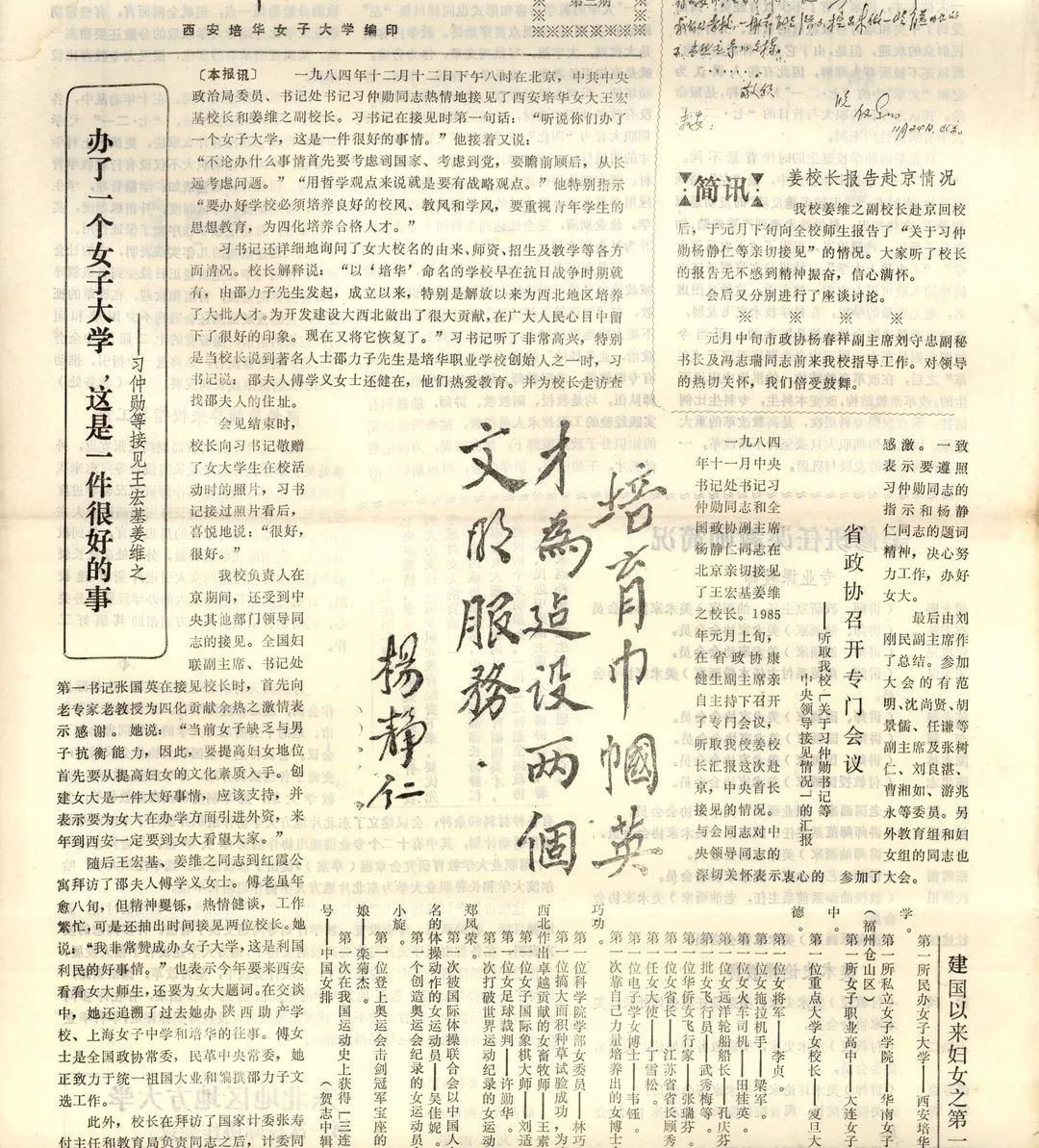 一九八四年十二月十二日,时任中共中央政治局委员、书记处书记习仲勋同志听取了创办西安培华女子大学的相关汇报,省政协召开专门会议传达习仲勋接见培华女子大学校长王宏基、副校长姜维之情况