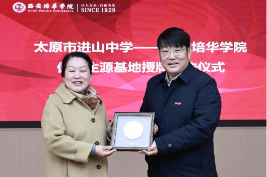 招生与就业指导中心主任姚斌与进山中学校副校长周一签订“西安培华学院优秀生源基地”协议并授牌