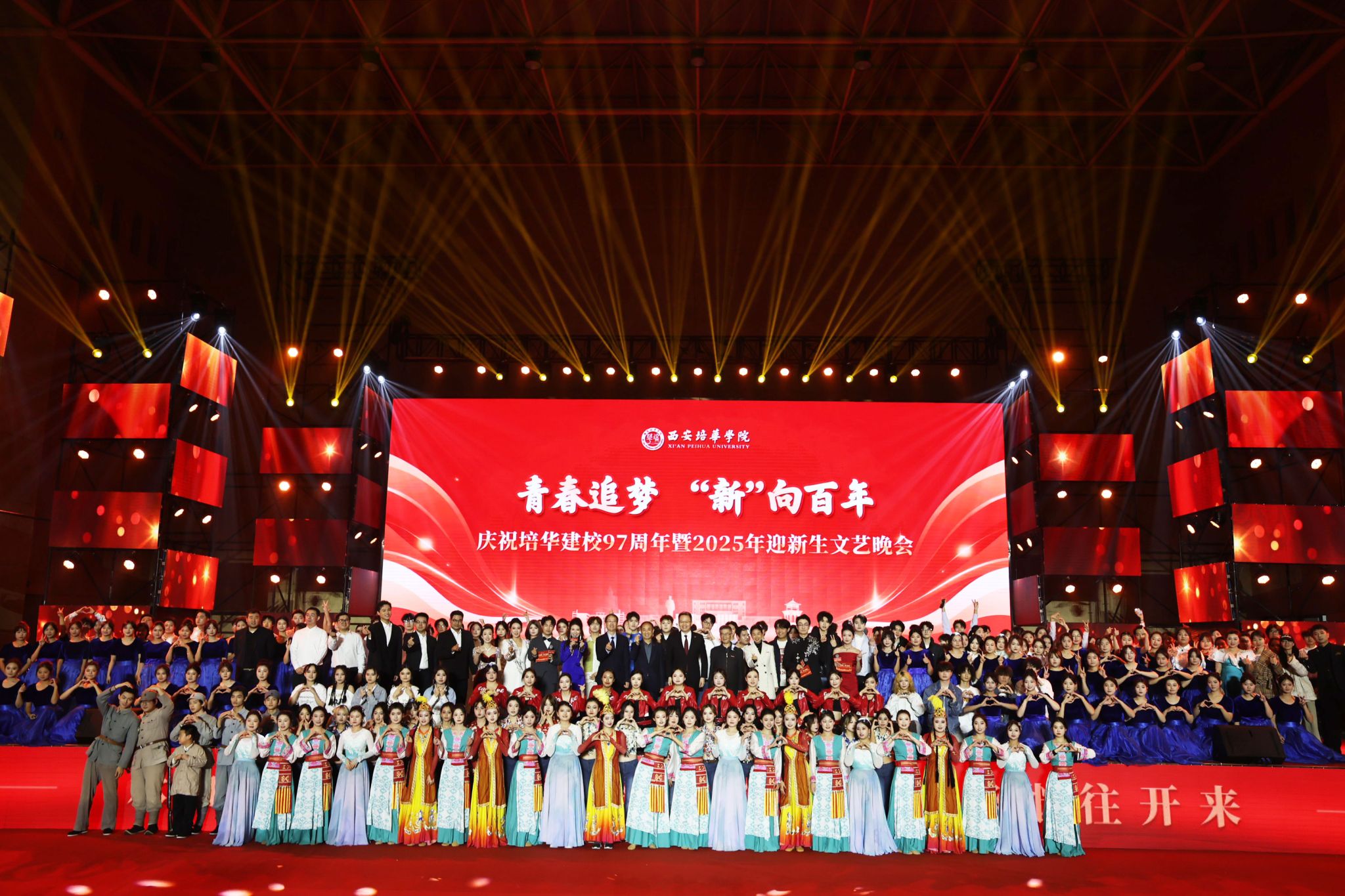 时光长河,在此泛起青春的涟漪,星辰大海,在此照亮梦想的启航。10月23日晚,西安培华学院建校97周年暨2025年迎新生文艺晚会在五棵松体育馆举行。西安培华学院理事长姜波、党委书记刘锋、副校长姚文静、国际校长李华,各二级学院师生代表出席。本次晚会由传媒与设计学院播音与主持艺术专业教师巨梦、网络与新媒体专业教师陈肖雄、以及播音与主持艺术专业学子付羽洁、王子帆主持。