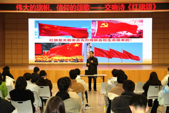 最后,刘教授讲到《红旗颂》这部作品从诞生之日起,它优美动听的旋律激发和感化着我们一代又一代,点燃着我们人生激情的火花,交织着社会的共鸣。让我们时刻记住:我们的幸福是来之不易的!让我们继续在红旗的引领下,奋勇向前,奏出时代的最强音!