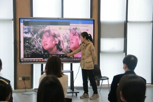 张靖雯老师分别从歌曲《绒花》的创作背景、曲式分析、音乐风格、歌曲演变等几个方面给在座师生进行分享。为了聆听音乐背后的故事,她先后为大家播放了由李谷一、韩红、谭晶、廖昌永等歌唱家演唱的不同版本的声乐作品《绒花》。