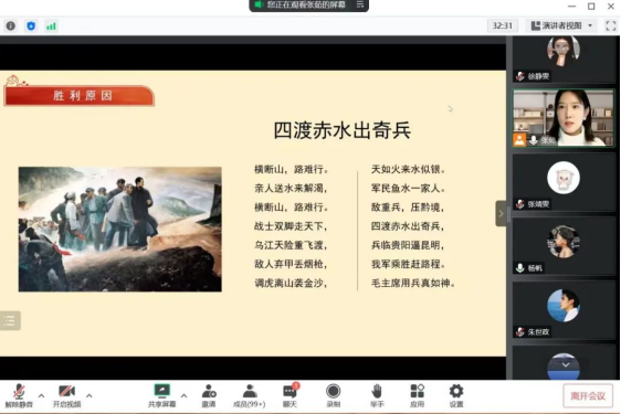 张茹老师分别从红军四渡赤水的战争概况与背景、战争经过与路线、胜利原因及意义、《四渡赤水出奇兵》歌曲内容与欣赏等四个方面给在座师生进行了分享。为了让师生能够深刻了解到《四渡赤水出奇兵》歌曲的背景,张茹老师详细讲述了红军长征时的故事。并且带给大家分享了由廖昌永、吴娜所演唱的《四渡赤水出奇兵》视频资料。