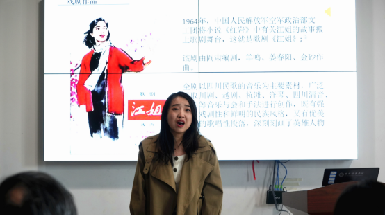 李老师还给大家介绍了歌剧《江姐》作品中刚柔并济、抑扬顿挫的演唱特点。为引发同学们共情,艺术教育中心刘晗悦老师为大家现场演唱了歌剧《江姐》里的声乐作品《绣红旗》。刘老师那细腻婉转、技艺精湛的唱腔令在座的每个人沉醉,深受打动,讲座氛围温馨热烈,反响积极。