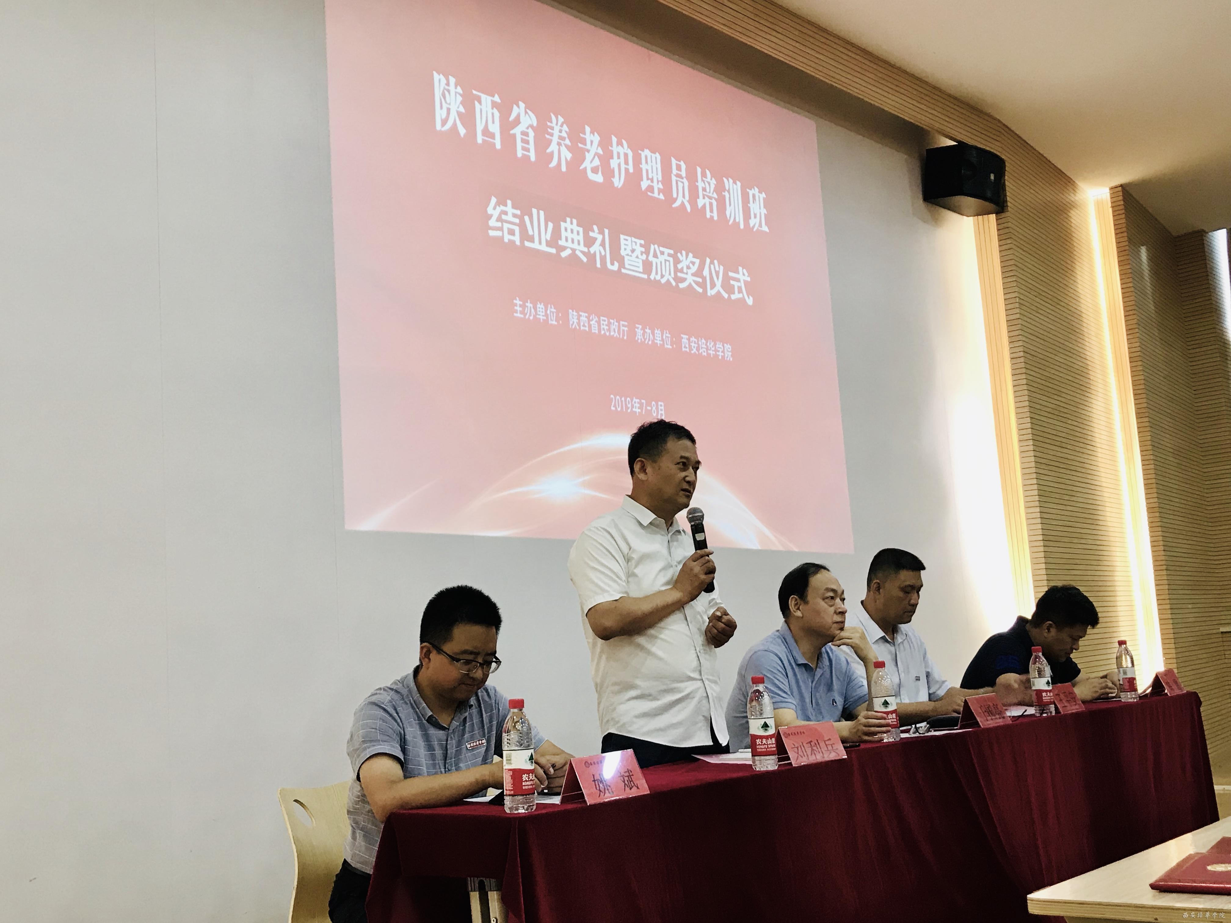 7月17日,由陕西省民政厅主办、西安培华学院承办的陕西省2019年初级养老护理员培训(第一期)顺利结业,结业典礼在培华学院博远楼J201报告厅举行。西安培华学院副校长、医学院院长于国亮,医学院副院长陈雷、党委书记姚斌,医学院基础系刘利兵教授及相关教师,以及来自省内各地市100名从事养老护理服务工作的护理人员参加了典礼。医学院常务副院长王平安主持结业典礼。
