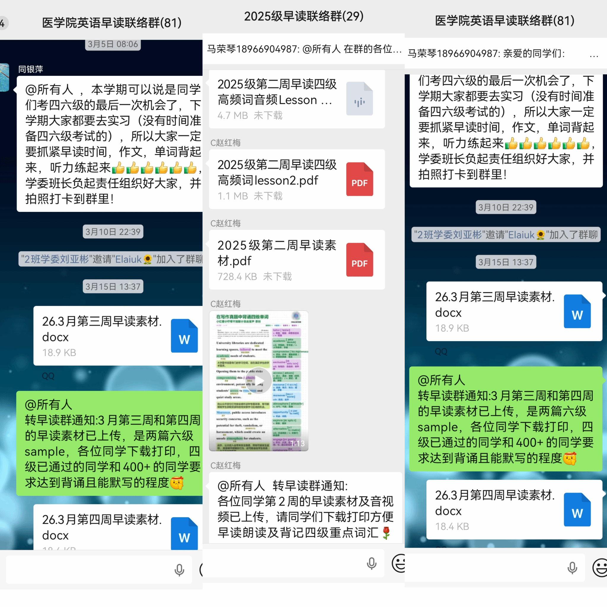 作为我院大学英语教学改革的重要实践环节与特色载体,“朗朗晨读”被系统纳入学院英语能力提升整体方案,成为全院师生共同推进教学改革、夯实语言基础、“提升六率”的关键举措。结合教学改革安排,大英教师根据三个年级学生学情与四、六级备考不同需求,分层分类设定早读素材,每周动态更新。大一学生强化外刊阅读,帮助其熟悉考试阅读素材来源;大二学生重点强化写作、翻译能力,配套详注历年写、译真题,引导学生背诵、默写、仿写最后达到能写;为大三学生精准配备六级写、译与听、说素材,满足差异化、进阶式学习需求。在每日晨读中,学生不断强化语感、积累词汇、提升听、说能力,真正将教学改革从课堂延伸至课外、从被动听课转变为主动习得,为四、六级通关筑牢坚实语言根基。朗朗晨读也成为学院深化教学改革、强化学风建设的一道亮丽风景,有效激发提升的内生动力。