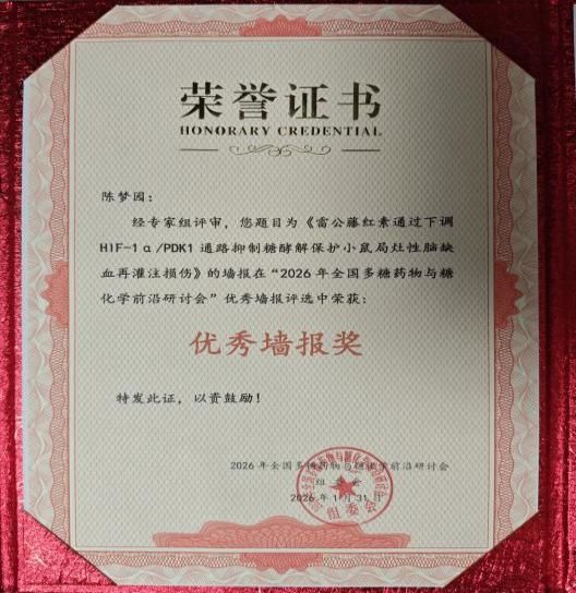 青年教师陈梦园凭借墙报《雷公藤红素通过下调HIF-1α/PDK1通路抑制糖酵解保护小鼠局灶性脑缺血再灌注损伤》荣获大会颁发的“优秀墙报奖”。除获墙报奖外,陈梦园老师全程深度参与了本次高水平学术盛会,并认真聆听了领域权威的前沿报告,系统把握了多糖药物基础研究新理论、糖类药物研发关键技术突破以及植物多糖应用开发的最新趋势。