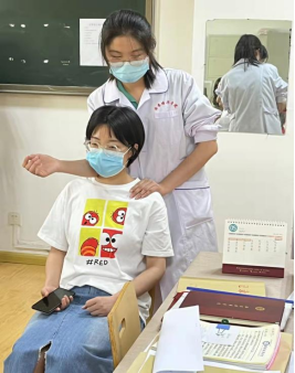 志愿者为传媒学院教工进行中医肩颈按摩理疗服务