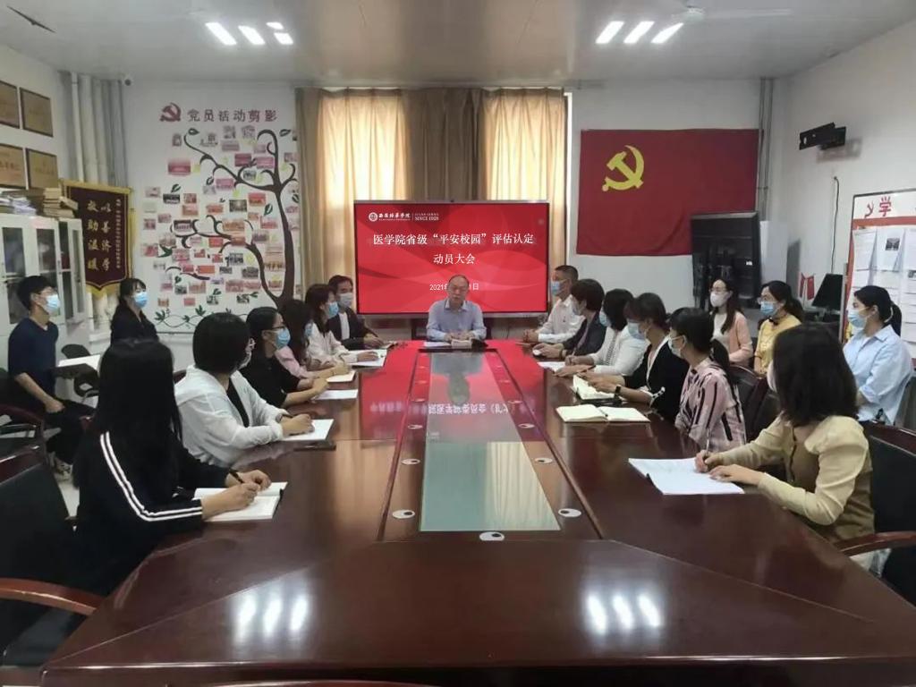 根据《中共西安培华学院委员会关于省级“平安校园”评估认定工作实施方案》精神和要求,2021年10月11日9:30分,医学院在至善楼8330党员活动室召开省级“平安校园”评估认定动员大会。西安培华学院副校长兼医学院院长于国亮、医学院常务副院长扈国栋、党委书记兼行政副院长王平安、教学副院长王菊宁、科研副院长王巧峰、党委副书记何丽,院党委委员、各支部书记、各系主要领导及教学干事、学生干事参加会议。会议由医学院党委书记兼行政副院长王平安主持。