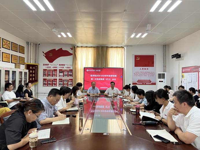 8月26日上午,医学院在至善楼8330会议室召开了2024-2025学年春季新学期第一次党政联席(扩大)会议暨8月份教学工作例会。全体院领导、各系(专业)中心主任、副主任、专业带头人、综合办干事和学生干事参会,会议由常务副院长扈国栋主持。