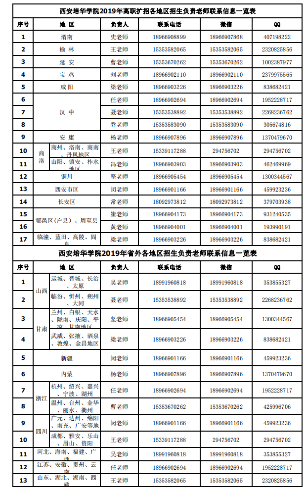西安培华学院2019年高职扩招各地区招生负责老师联系信息一览表