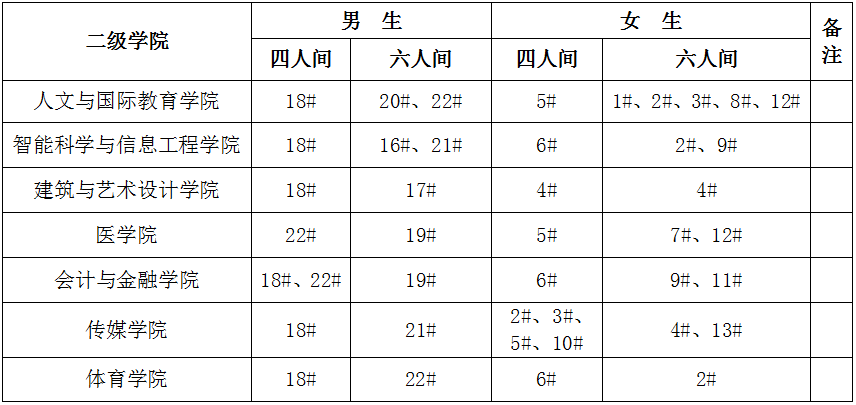 为迎接我校2021级新生入学,确保新生顺利入住宿舍,根据我校的录取人数,结合学生新生预留宿舍情况,现将2021级统招新生宿舍分配方案公布如下: