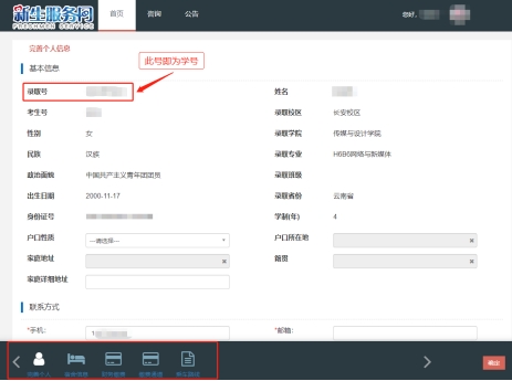 密码修改完成后,进入网上报到注册流程页面,点击“完善个人信息”根据系统提示,按要求如实填写个人信息,信息填写完毕后,点击进入查看宿舍信息,选取宿舍,不完善个人信息,无法进入“宿舍选取”环节;