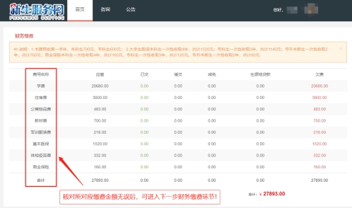 第六步:查看缴费金额(温馨提醒:宿舍选择完成一小时后,再进行缴费)