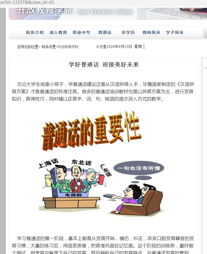 我校运营微信公众号“开放在线”以及校园官网,通过在官方微信公众号和微博以及校园官网发布推普相关安全知识,利用网络的便捷性和广泛性加强宣传力度,向学生普及学好普通话的必要性和重要意义,提高师生对于学习普通话的热情,为此次活动开展营造浓厚的氛围。