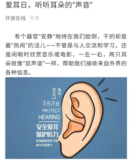 学校利用宣传栏、微信平台等多种渠道向学生宣讲爱耳护耳知识,让学生了解耳朵的构造,知晓了不良的戴耳机、挖耳、噪音、不合理饮食等习惯给耳朵带来的巨大损害,学习了保护耳朵的方法,避免意外伤害耳朵的事故发生,学生们纷纷表示,从现在起要改变过去不良的用耳习惯,保护好听力,健康成长。
