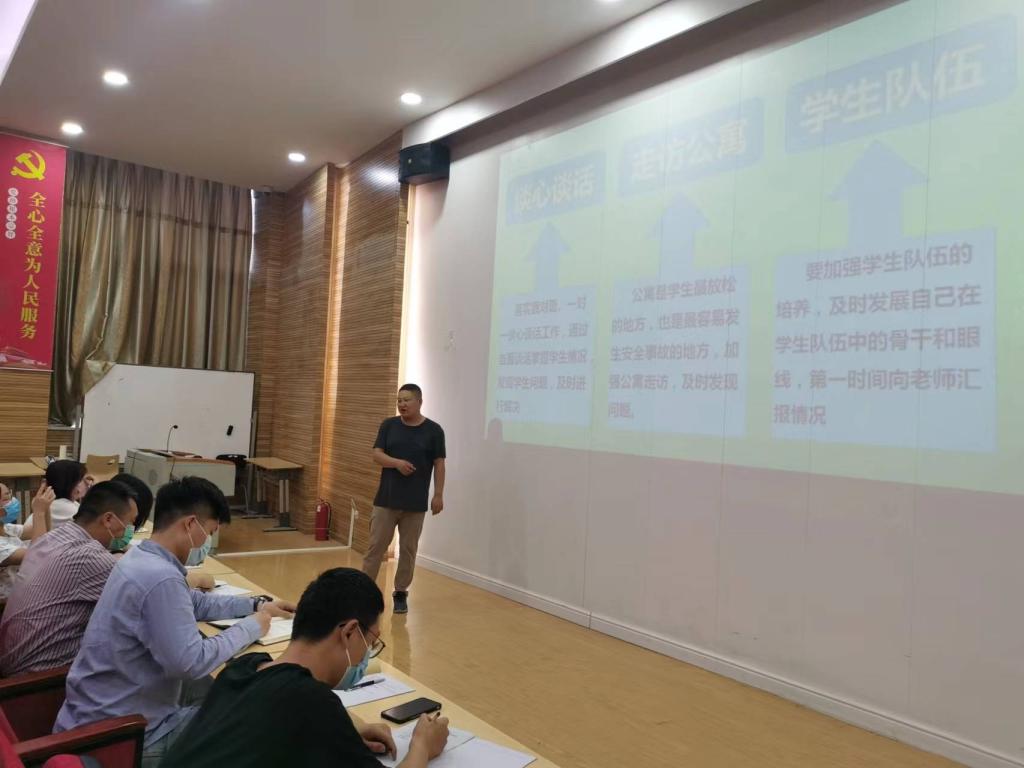 本次培训的主题为“如何成为合格班主任”,蔡老师结合自己的工作经验进行分享和讲解。本次内容涵盖⽐较全⾯,涉及学⽣⼼理健康教育、突发事件的预防及应对、学⽣思想政治⼯作等方面,旨在通过此次培训让新入职的班主任快速掌握正确工作方法和处理突发事件的能力。