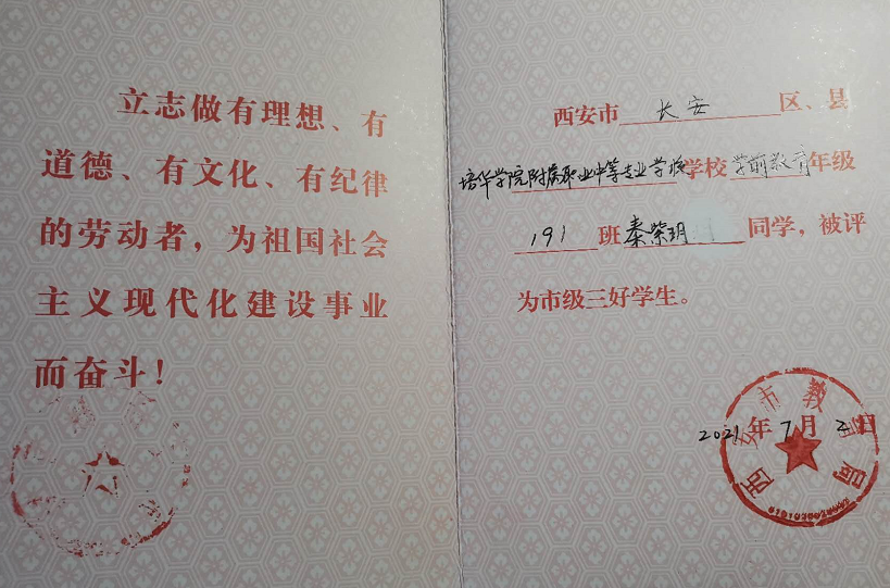 秦紫玥同学曾获得2020至2021学年中等职业教育国家奖学金、西安市三好学生等荣誉称号。