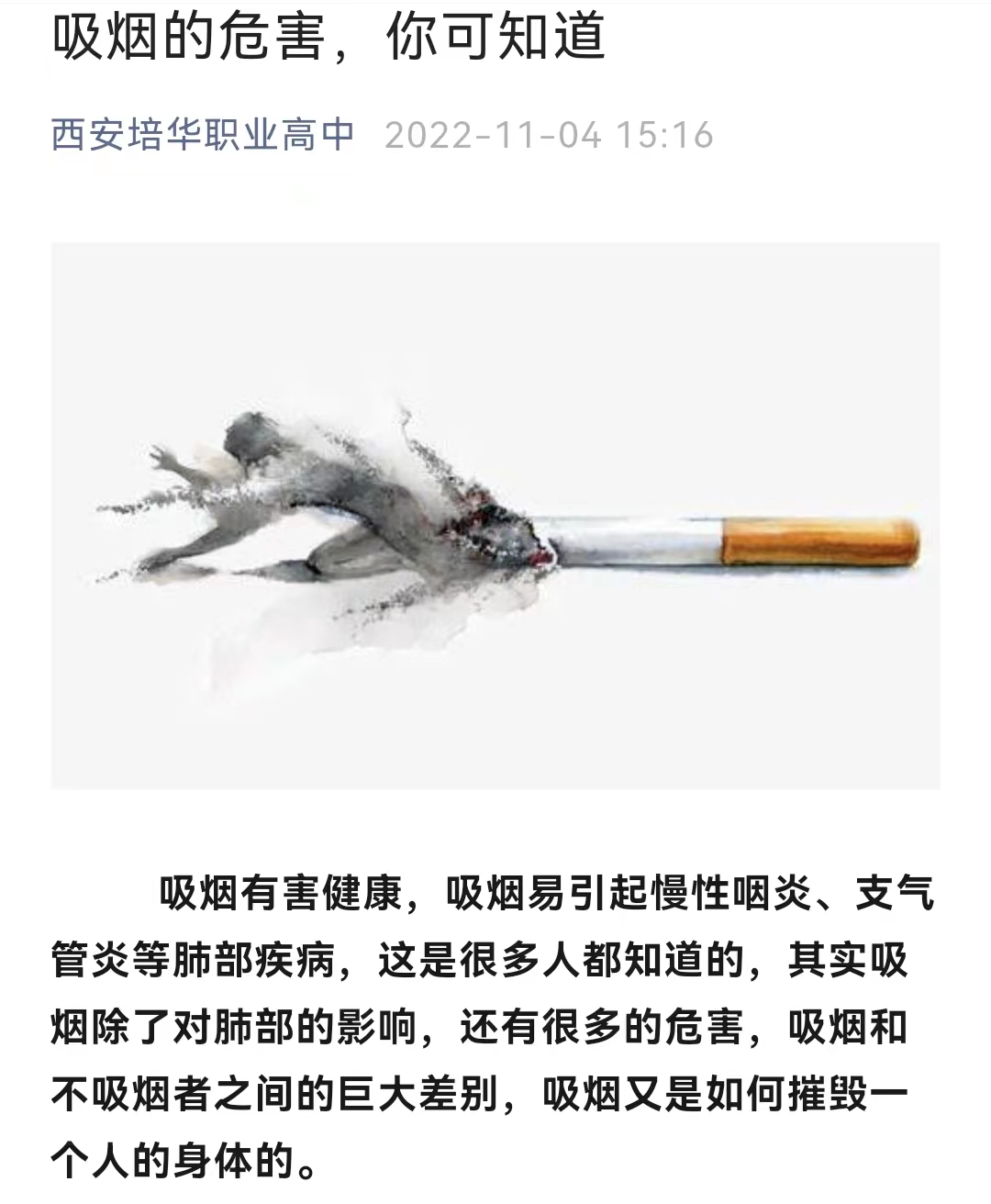 为引导学生树立健康的生活习惯,充分了解香烟带来的危害,创造绿色和谐的校园环境,促进青少年健康成长。根据《西安市控制吸烟管理办法》和《西安市长安区教育局关于加强全区教育系统控烟工作的通知》文件精神,我校结合防疫要求开展了主题为“拒绝吸烟 从我做起”的主题教育活动。