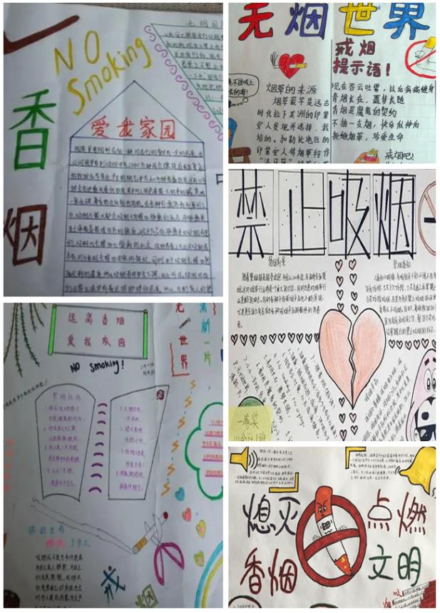 为能够让学生身体力行参与到禁烟活动中,通过实践支持校园文明建设活动,我校组织学生进行了拒绝吸烟主题手抄报的创作,同学们在创作和绘画的同时也接触到了健康生活的理念,学习了禁烟相关知识,不仅是把色彩和文字描绘到纸上,更是把法健康生活的意识深深的描绘在心里,切实落实了本次禁烟活动的目的。