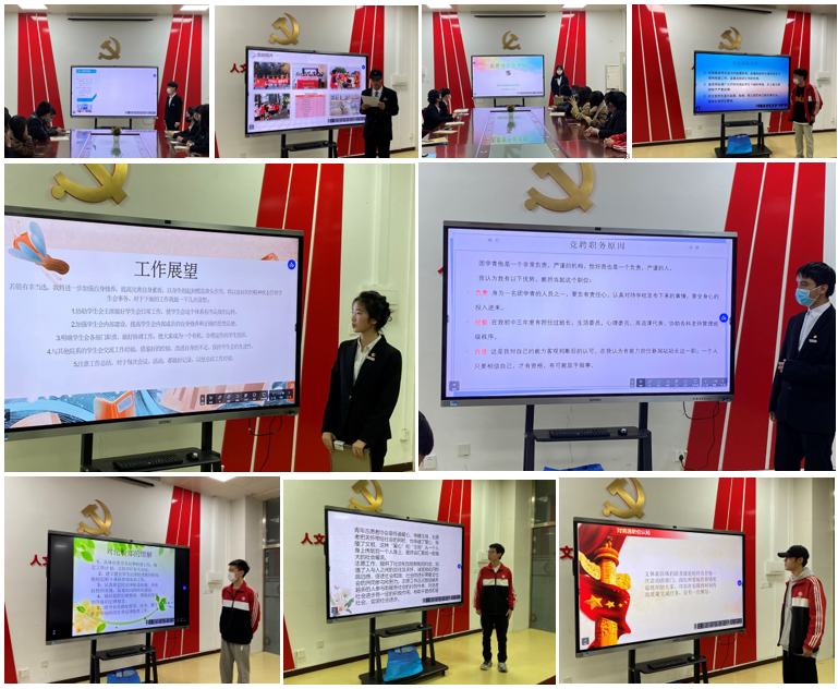 答辩人分别从个人简介、竞争优势、岗位认知和工作展望等方面进行阐述,讲述了各自担任学生干部的心得体会与经验收获,充分展示了我校团学工作的成果。