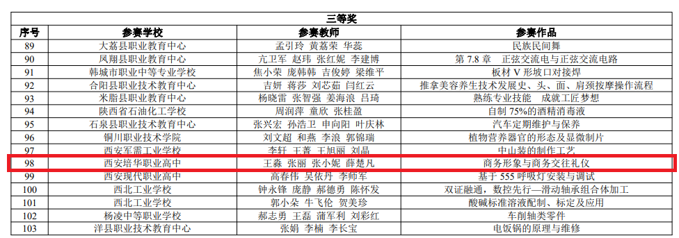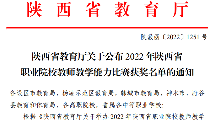 2022年11月19日,陕西省教育厅公布了2022年陕西省职业院校教师教学能力比赛获奖名单,我校王淼、张丽、张小妮、薛楚凡四位教师荣获2022年陕西省职业院校教师教学能力比赛专业课程组三等奖。
