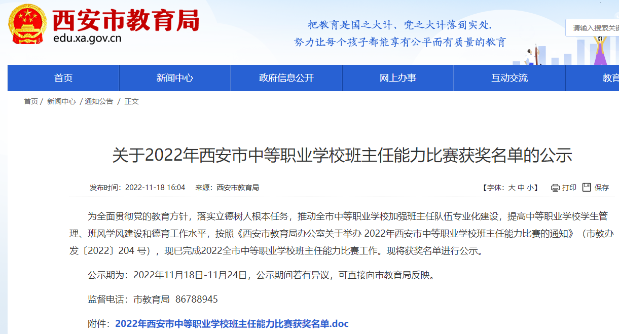 2022年11月18日,西安市教育局公布了2022年西安市中等职业学校班主任能力比赛获奖名单,我校郭茹老师荣获2022年西安市中等职业学校班主任能力比赛二等奖。