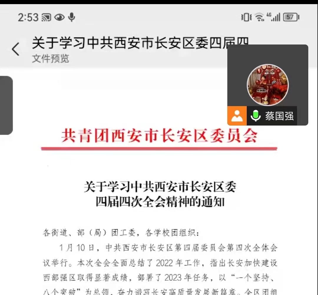 校团委书记蔡国强老师召开了线上主题学习会,带领大家共同学习《关于学习中共西安市长安区委四届四次全会精神的通知》要求,认真领会西安市长安区委书记吕强同志在会上的报告内容。希望我校共青团员加强理论学习,提高思想觉悟,不负韶华、踔厉奋发、勇毅前行,用奋斗和拼搏书写青春华章。