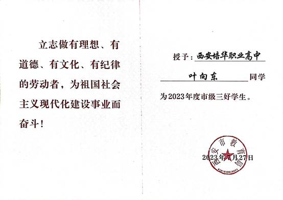 在2023年度西安市“三好学生”“优秀班干部”和“先进班集体”的评选活动中,我校叶向东、李泽治、王颖同学荣获西安市“三好学生”称号,艺术设计与制作211班荣获西安市“先进班集体”称号。