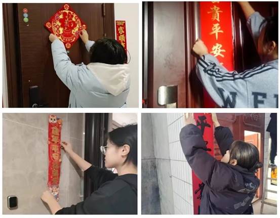 贴春联是过年的重要习俗,表达了人民对美好生活的向往和期盼。同学们纷纷亲自上阵,贴春联、挂灯笼、贴福字、挂福件,通过实际行动营造浓厚的节日氛围。
