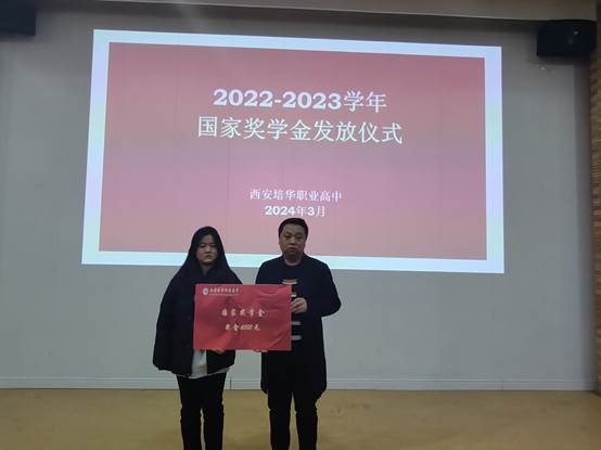 党支部书记罗永辉为获得教育部2022—2023学年度中等职业教育国家奖学金的王颖同学颁奖,勉励获奖学生开拓进取、再接再厉,要求其他同学以获奖同学为榜样,勤奋学习、勇于实践,不断提升综合素质和专业水平,努力成为国家和社会需要的高素质应用型人才。