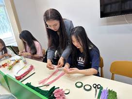 姚倩老师详细介绍了母亲节的背景和意义,亲身示范如何编制精美的工艺花束,对手工编制的技巧和步骤进行耐心指导。希望同学们在完成作品之后,可以将作品送给母亲,为母亲献上最美好的祝福。