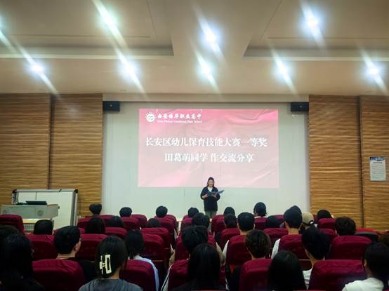 西安市三好学生王颖同学和长安区2023年幼儿保育技能大赛一等奖获得者田葛萌同学作交流分享。王颖同学提到了课前预习和课后复习的重要性,要及时通过习题练习巩固课本知识;田葛萌同学分享参赛心得,要在提升专业技能方面多下功夫,面对比赛中出现的问题要冷静应对、灵活处理,才能在大赛中取得佳绩。