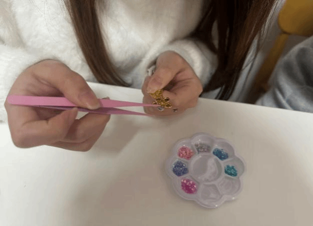 同学们在老师指导下开启“创作之旅”,从打磨木梳基底的耐心细致,到挑选螺钿薄片的精挑细选,再到用胶水固定、用砂纸打磨的步步用心,每一个步骤都充满挑战与乐趣。同学们充分发挥自己的创意,将一片片螺钿精心排列组合,原本朴素的饰品基底在他们手中逐渐焕发出绚丽光彩。