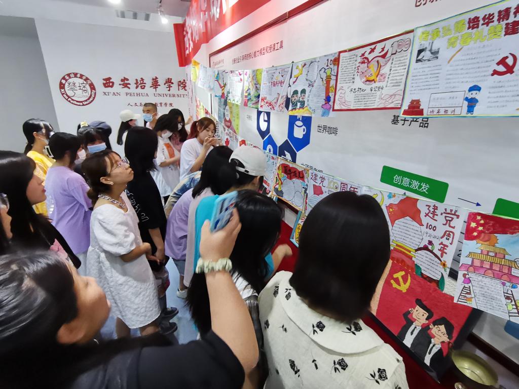 本次展示的绘画作品多以中国共产党成立100周年为主题进行创作,内涵丰富、制作精良,吸引了众多学生前来观看。除了绘画作品的展示以外,还有很多优秀学生获得奖杯也进行展览,同学们纷纷拿出手机进行拍照,对展示的作品大加赞赏。